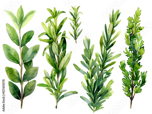 © Bussakon, Fototapeta premium Watercolor Herb Leaf Set on White Background Fresh Culinary Botanical