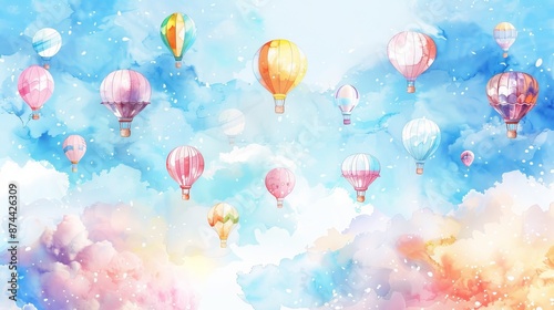 Fototapeta premium Watercolor Hot Air Balloons in Pastel Sky