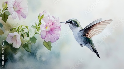 © Muhamat, Naklejka premium Watercolor hummingbird feeding on a flower
