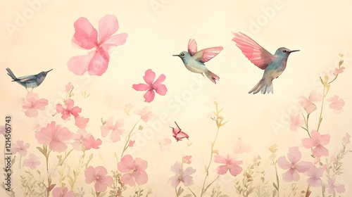 Fototapeta premium Watercolor Hummingbirds and Flowers Spring Floral Birds Pastel Bird Art