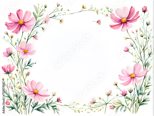 © aironamad, Naklejka premium watercolor-illustration-baby-cosmos-flowers-forming-a-delicate-minimalist-frame-floating-without