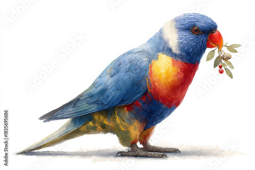 © TK188, Fototapeta premium Watercolor illustration clipart of a single Santa rainbow lorikeet holding a tiny Christmas tree ornament in its beak, isolate on white background