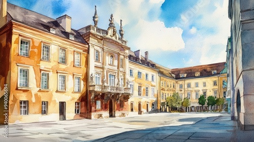 © AbstractAI, Obraz premium Watercolor illustration depicting the architectural features of a royal square on a sunny afternoon