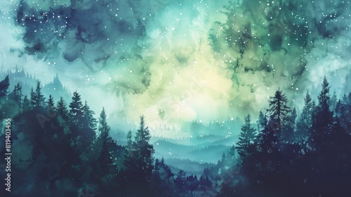 Fototapeta premium Watercolor Illustration Landscape with Fantastic Starry Sky and Forest.