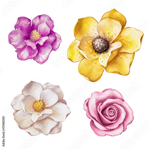 © wacomka, Naklejka premium watercolor illustration, magnolia, rose, assorted flower collection, floral design elements isolated on white background