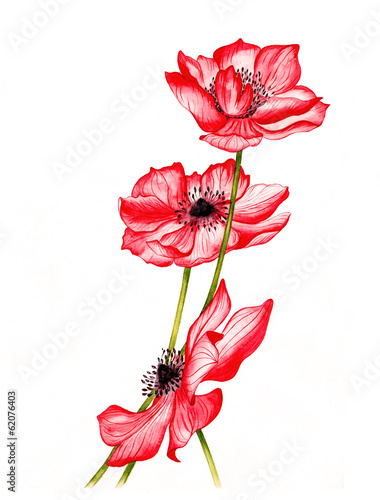 Fototapeta premium Watercolor illustration of a beautiful red anemones flowers
