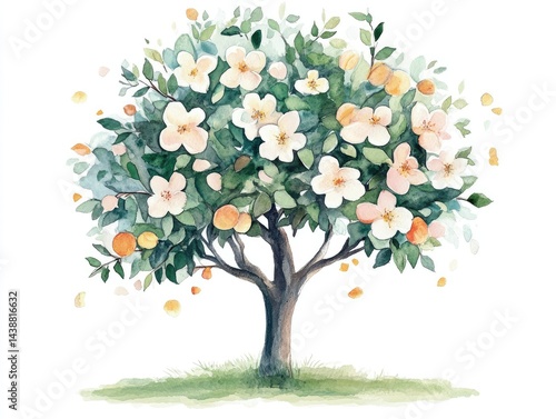 Fototapeta premium Watercolor illustration of a blossoming fruit tree with oranges and peach-colored flowers