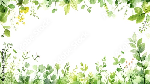 © amin, Fototapeta premium Watercolor illustration of a botanical border with various leaves and flowers.