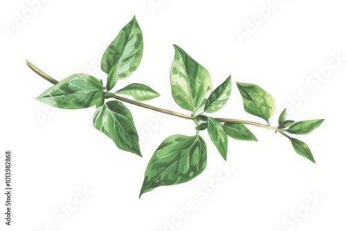 Fototapeta premium Watercolor illustration of a branch with green variegated leaves on a white background. Gymnema. Ayuurveda. Ayurvedic herbs. Generative AI