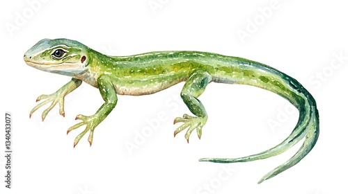 © rehan, Obraz premium Watercolor illustration of a bright green lizard on white background
