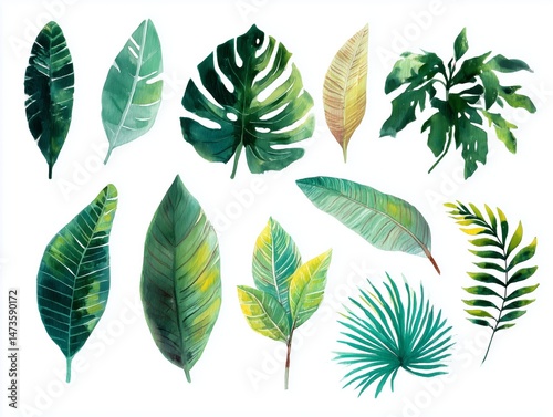 Obraz premium Watercolor illustration of a collection of tropical leaves, white background