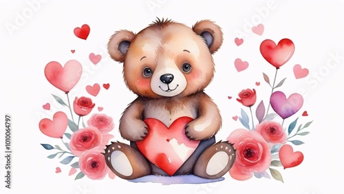 Obraz premium Watercolor illustration of a cute teddy bear holding a heart, surrounded by pink roses and hearts.
