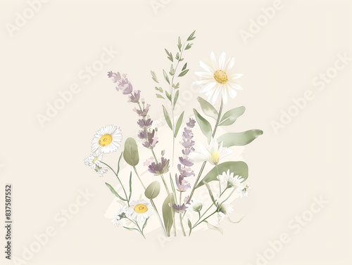 Naklejka premium Watercolor illustration of a delicate bouquet of lavender and daisies.