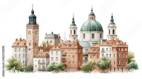 Naklejka premium Watercolor illustration of a European cityscape featuring a variety of buildings, including churches with domes and