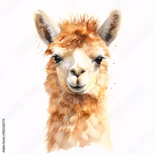 Obraz premium Watercolor illustration of a fluffy, light brown alpaca