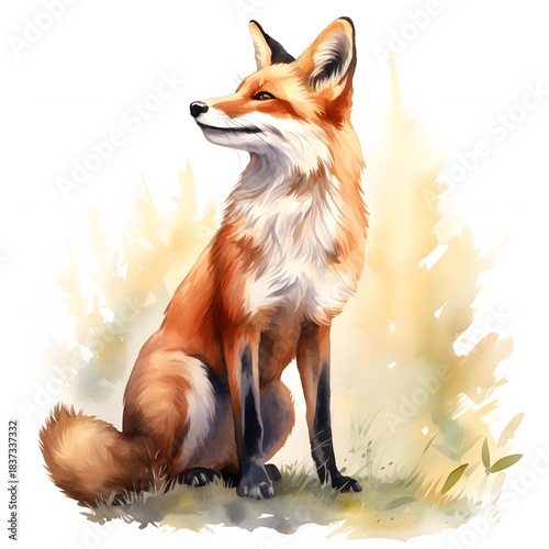 © Studicon, Obraz premium Watercolor illustration of a fox sitting in a grassy field looking into the distance