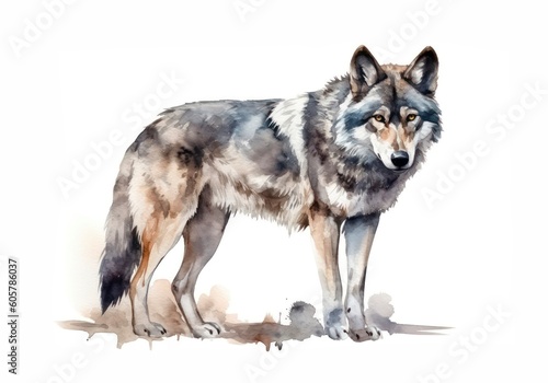 © Hanna, Fototapeta premium Watercolor illustration of a gray wolf on white background. Generative AI.