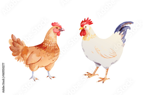 © Md, Fototapeta premium Watercolor illustration of a hen and a rooster facing each other