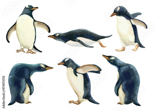 © Лариса Хамукова, Fototapeta premium Watercolor illustration of a penguin in 6 different angles. It can be used to design children's books, advertise tourist trips to Antarctica, design souvenirs and accessories for zoos and marine parks