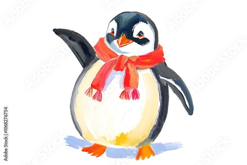 © Danainat, Obraz premium Watercolor illustration of a penguin tie a red scarf white background