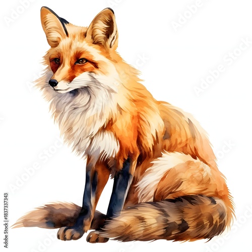 Obraz premium Watercolor illustration of a red fox sitting with its tail curled around its...