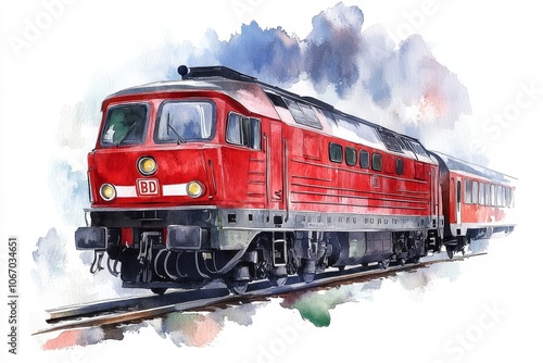 © AI Photo Stock, Obraz premium Watercolor illustration of a red freight train, symbolizing transportation, industry, speed, power, and travel.