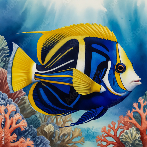 Naklejka premium Watercolor Illustration of a Regal Blue Tang Swimming Among Vibrant Coral in...