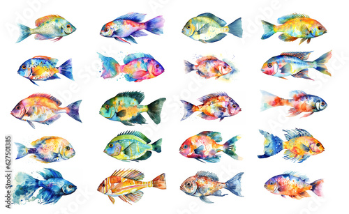 Naklejka premium Watercolor illustration of a set of exotic fish with a splash of watercolor paint on a white background , generative AI