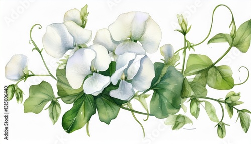 © luis, Fototapeta premium watercolor illustration of a sprig of white sweet pea flowers on a white background summer botanical drawing for wedding invitations or cards print
