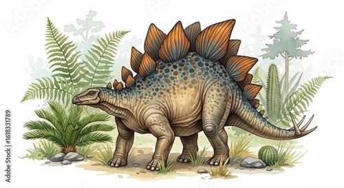 Obraz premium Watercolor Illustration of a Stegosaurus in a Lush Prehistoric Landscape
