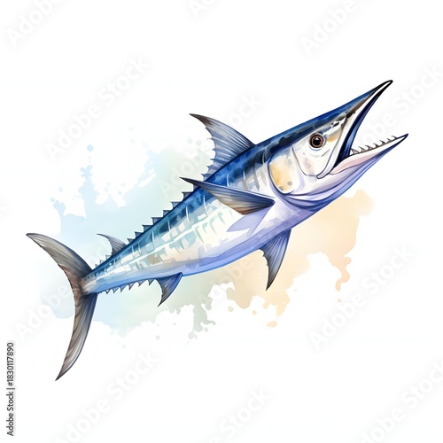 © Studicon, Fototapeta premium Watercolor illustration of a wahoo fish jumping with its mouth open in the ocean