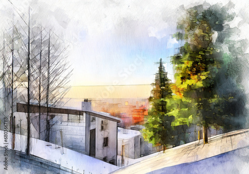Fototapeta premium watercolor illustration of a winter atmosphere with snow covering ground and...
