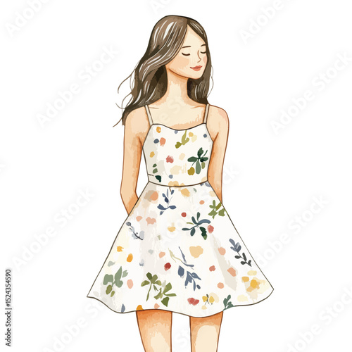 Fototapeta premium Watercolor Illustration of a Woman in Floral Dress with Eyes Closed