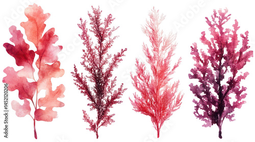 Fototapeta premium Watercolor illustration of diverse red seaweeds on a transparent background