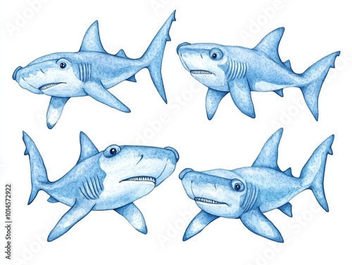 Naklejka premium Watercolor Illustration of Four Blue Sharks