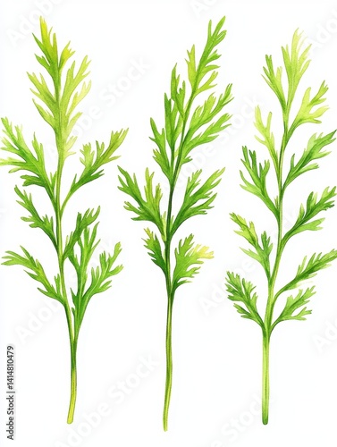 © Sarinya, Fototapeta premium Watercolor Illustration of Fresh Green Aromatic Herb Sprigs on White Background Botanical Art Style