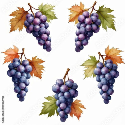 Obraz premium Watercolor illustration of grapes. Beautiful bunches of grapes with leaves and vines, perfect for invitations and stationary designs. Autumn harvest, organic natural food.