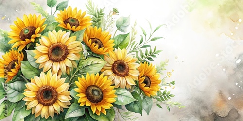 © suchetpong, Obraz premium watercolor illustration of high angle sunflower bouquets with greenery