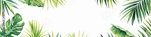 Fototapeta premium Watercolor illustration of isolated green palm leaves on a white background, copy space, banner