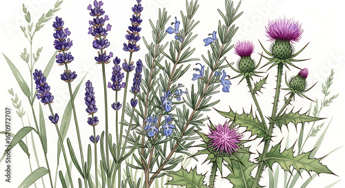 Naklejka premium Watercolor illustration of lavender rosemary and thistle plants.