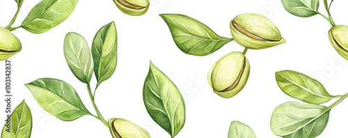 © pornsawan, Naklejka premium Watercolor illustration of Pistachios nuts isolated on white background,Watercolor hand drawn illustration,Hand drawn nuts,hand drawn set design template for packaging,for menu cafe,copy space.