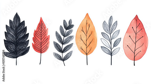 Fototapeta premium Watercolor illustration of six leaves in various colors.