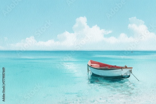 © ant, Naklejka premium watercolor illustration of small boat on calm turquoise sea, pastel blue sky, peaceful escape