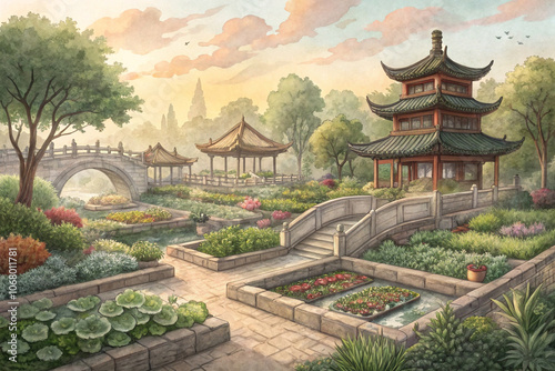 © FH, Fototapeta premium Watercolor Illustration of Traditional Asian Medicinal Herb Garden with Pagoda and Stone Bridge - Graphic Design Resource