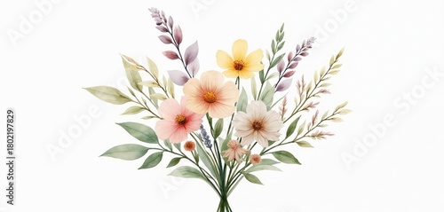 Fototapeta premium Watercolor illustration of wildflower bouquet isolated on plain white background. Elegant floral arrangement with colorful pastel flowers, fresh green leaves. Delicate botanical drawing beautiful