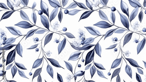 © Fang, Obraz premium Watercolor illustration painting of blueberry branches with leaves, isolated on white background, seamless pattern, Generative AI