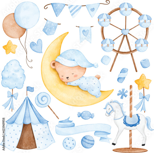 © Stella, Naklejka premium Watercolor illustration set of cute nursery clipart for baby boy