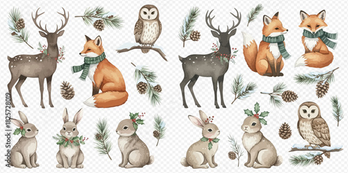 Naklejka premium Watercolor illustration set of various forest animals and winter foliage...