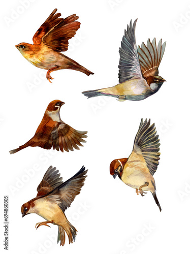 © natalia, Obraz premium Watercolor Illustration with Birds. Set with Flying Sparrows on a light background. Wildlife.