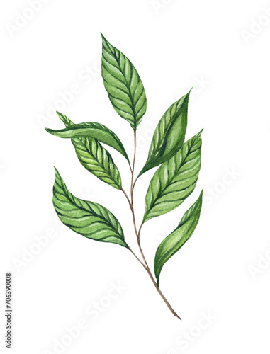 © Yana, Naklejka premium Watercolor illustration with green tea branch isolated on white background. Tea leaves and stem. Asian and Indian medicinal plant. Traditional hot drink, black, green and white tea. Packaging design.